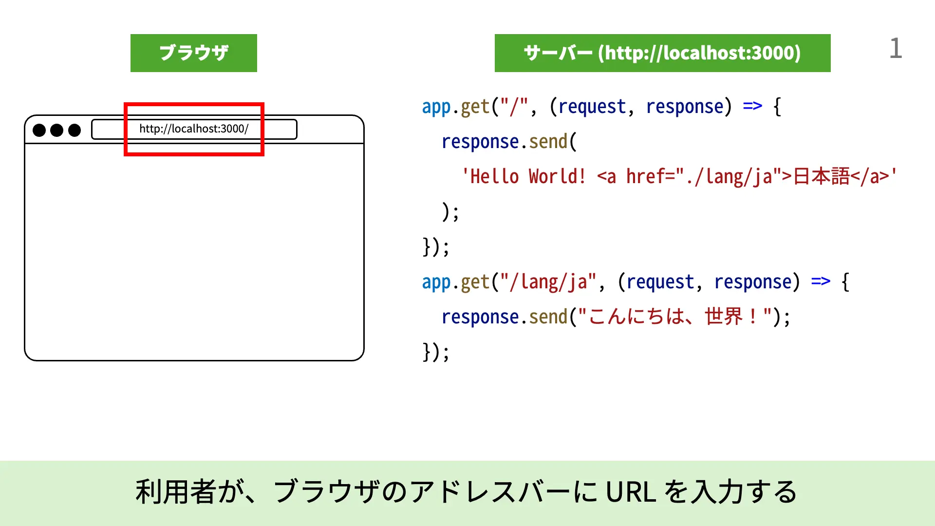 ブラウザは、アドレスバーにURLが入力されると、その情報をもとにHTTPを用いてサーバーと通信します。例えば、先ほどの例で使用したhttp://localhost:3000/lang/jaというURLは、次のように解釈されます。
