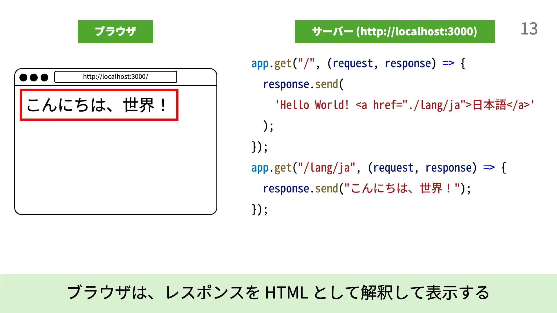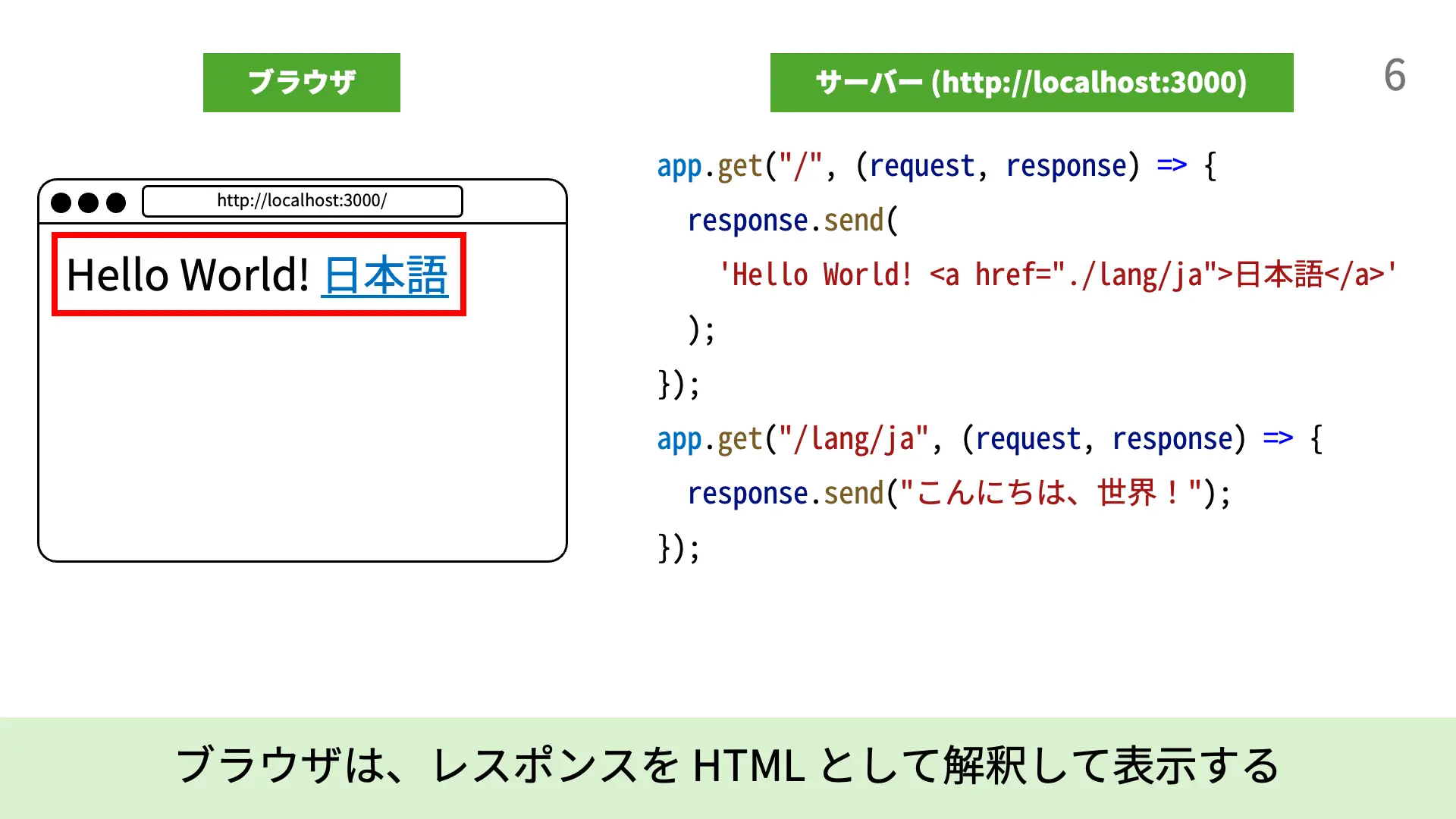 4. [5行目]response.send(`...`);により、Expressは`Hello World! <a href="./lang/ja">日本語</a>`という文字列をレスポンスとして送信します。